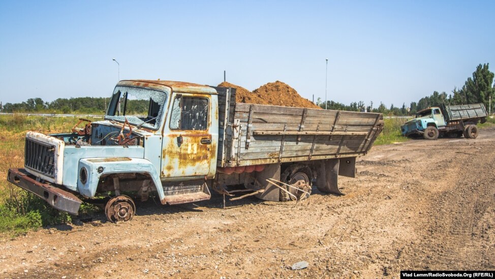 Знищені вантажівки перед блокпостом «Республіка міст»