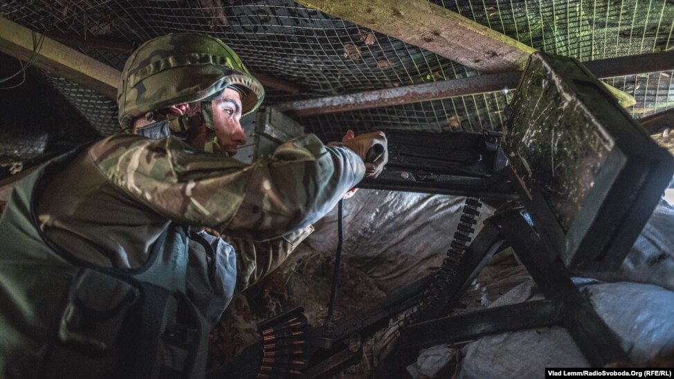 Боєць з крупнокаліберним кулеметом спостерігає за ділянкою фронту