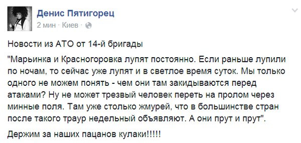 При этом обращают на себя внимание сообщения волонтеров о том, что ДНР фактически уже несколько дней подряд зондирует почву для штурма Марьинки (смотри скрин). Когда-то точно также неумело и бессмысленно они мучились в ДАП, однако в итоге своего добились; а за ценой русские не стоят. Тем более что есть слухи, что они уже сменили «ополченцев» на передовой, что может объяснять резкое ужесточение боев. Однако в Иловайске, ДАП и Дебальцево на стороне «русских» были географические условия, сейчас же у них такого преимущества нет, в том числе и под Марьинкой.