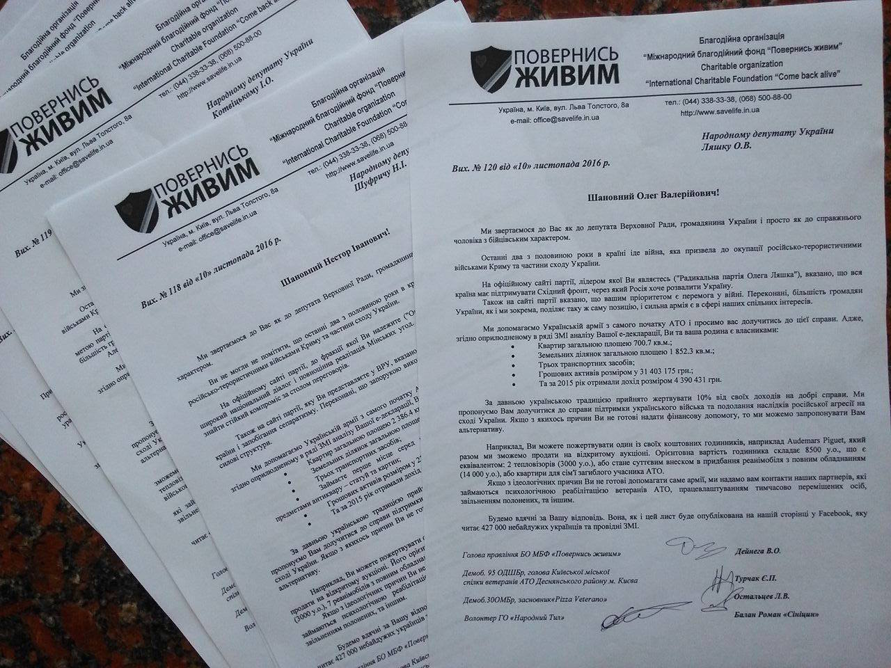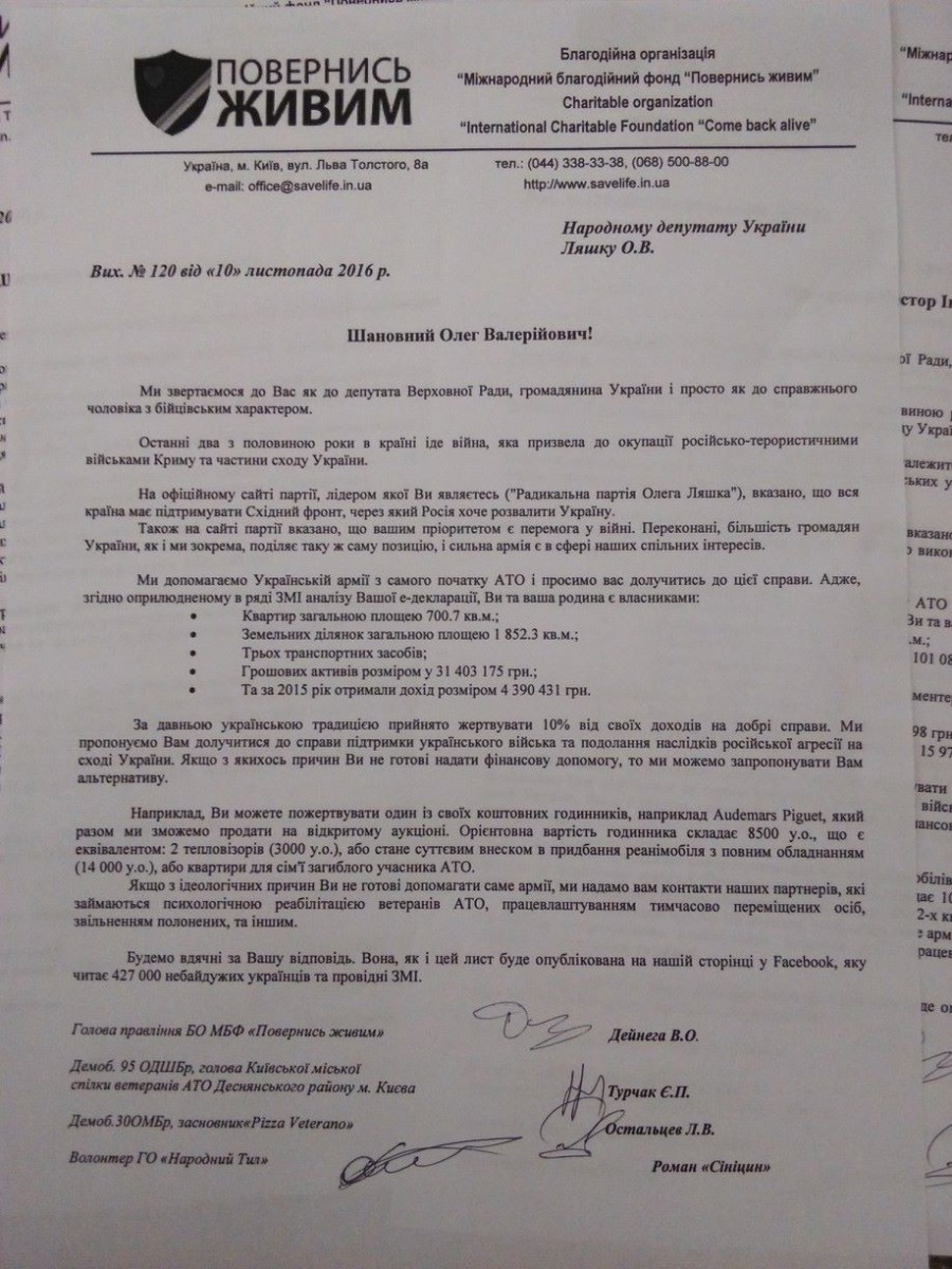 «Например, Вы можете пожертвовать один из своих автомобилей, тот же Mercedes G350, который вместе мы сможем продать на открытом аукционе. Его ориентировочная стоимость составляет 100 000 у.е., что является эквивалентом: 33 тепловизоров (3000 у.е.), 7 реанимобилей с полным оборудованием (14000 у.е.) или 2-х квартир для семей погибших участников АТО», — аргументируют волонтеры в письме.