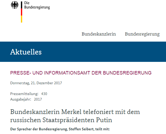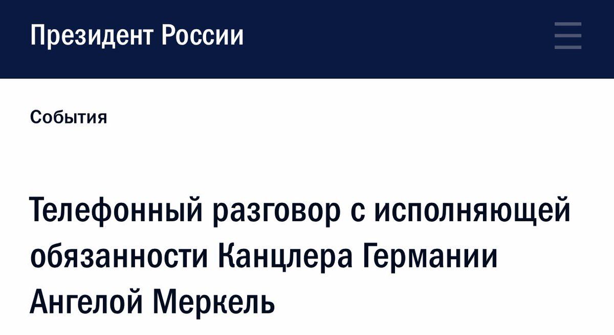 "Телефонный разговор с исполняющей обязанности Канцлера Германии Ангелой Меркель", - гласит заголовок новости на сайте Кремля.
